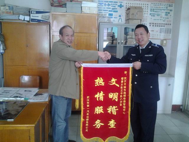 3月25日,武漢市第一汽車有限公司負責人將一面寫著“文明稽查 熱情服務”的錦旗交到稽查三中隊稽查隊員手中。