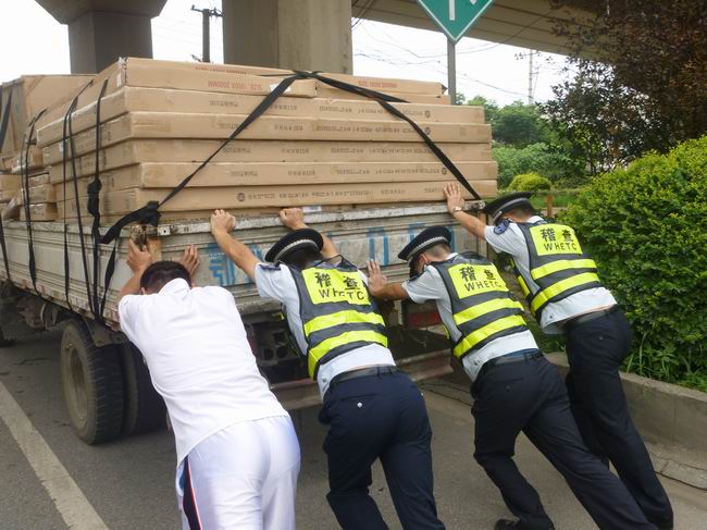 日前,稽查五中隊十五分隊在三環(huán)線長豐橋開展聯(lián)合執(zhí)法工作時,發(fā)現(xiàn)一輛滿載貨車停在百威立交橋附近,車旁的貨車司機愁眉不展地一邊打求援電話,一邊揮手?jǐn)r截過往車輛。見狀,稽查隊員主動上前詢問,獲知該車因高溫拋錨無法啟動,眼看交貨時間就要到了,車主焦急萬分,不知所措。在場的稽查隊員聽聞此情況后,立即幫助貨車司機推動起沉重的故障車。正值烈日當(dāng)空,炎陽炙人的時分,推車的隊員們已汗如雨下,全身濕透,可他們顧不上擦一把汗,全力以赴地幫助司機重新啟動貨車。當(dāng)貨車的發(fā)動機再次響起轟鳴聲時,該車司機連聲向稽查隊員表達(dá)感激之情,同時送上煙和飲料以示謝意,但被隊員們一一婉絕。
