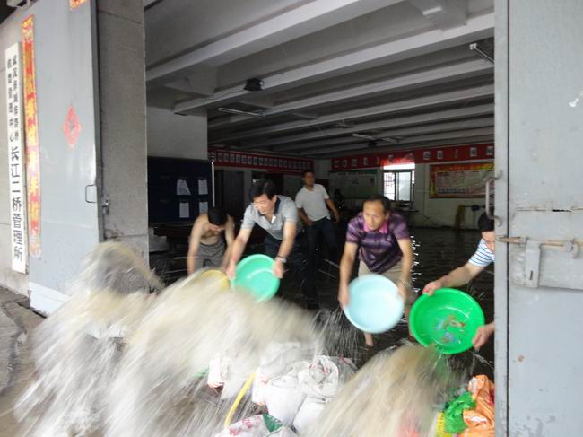 除道路漬水外,長江二橋管理所辦公室也被淹,配房房、機房進水。該處調(diào)動隊員,一方面將設施設備轉移至高處,調(diào)集100袋黃沙封堵管理所兩側大門,一方面采用人工排水。在連續(xù)作戰(zhàn)8小時后,排除了險情,保障了供配電設備以及橋梁監(jiān)控設備安全。