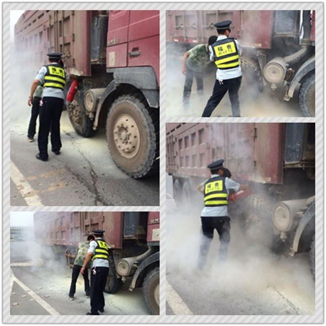 近日,天氣燥熱,路橋中心稽查二中隊(duì)五分隊(duì)在諶家磯服務(wù)站開展路橋通行費(fèi)稽查工作。一輛車牌鄂A籍紅色翻斗車右前輪胎冒著火苗向服務(wù)站駛來(lái),站在安全島前指揮車輛進(jìn)站的分隊(duì)長(zhǎng)趙爭(zhēng)發(fā)現(xiàn)此危情,急忙示意貨車司機(jī)停車,但該司機(jī)顯然對(duì)險(xiǎn)情毫無(wú)意識(shí),仍繼續(xù)駛向服務(wù)站車道。這時(shí)火勢(shì)加大,離車輪胎著火點(diǎn)不遠(yuǎn)處就是車輛油箱,隨時(shí)有發(fā)生爆炸的危險(xiǎn)。危急時(shí)刻,站在車道內(nèi)執(zhí)勤的稽查隊(duì)員龔偉快速走下道口將貨車攔停,在不明所以的司機(jī)驚詫下,立刻提起車道內(nèi)的滅火器沖向了正在燃燒的貨車。其他稽查隊(duì)員也聞?dòng)嵹s來(lái),在撥打119火警電話,并對(duì)司機(jī)講明原由后,紛紛加入救援的行列。經(jīng)過(guò)眾人的合力施救,大火終于被撲滅,雖然貨車輪胎嚴(yán)重?zé)龤?,但是車輛得以保存,現(xiàn)場(chǎng)無(wú)人員受傷。