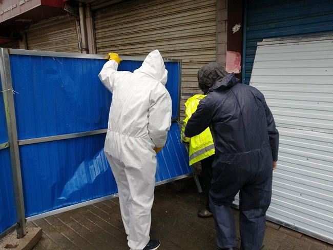 在梅隱寺社區(qū),隊(duì)員吳曼莉、李鋒隨社區(qū)網(wǎng)格員查看轄區(qū)路段,對(duì)大風(fēng)吹倒的圍欄擋板進(jìn)行恢復(fù)