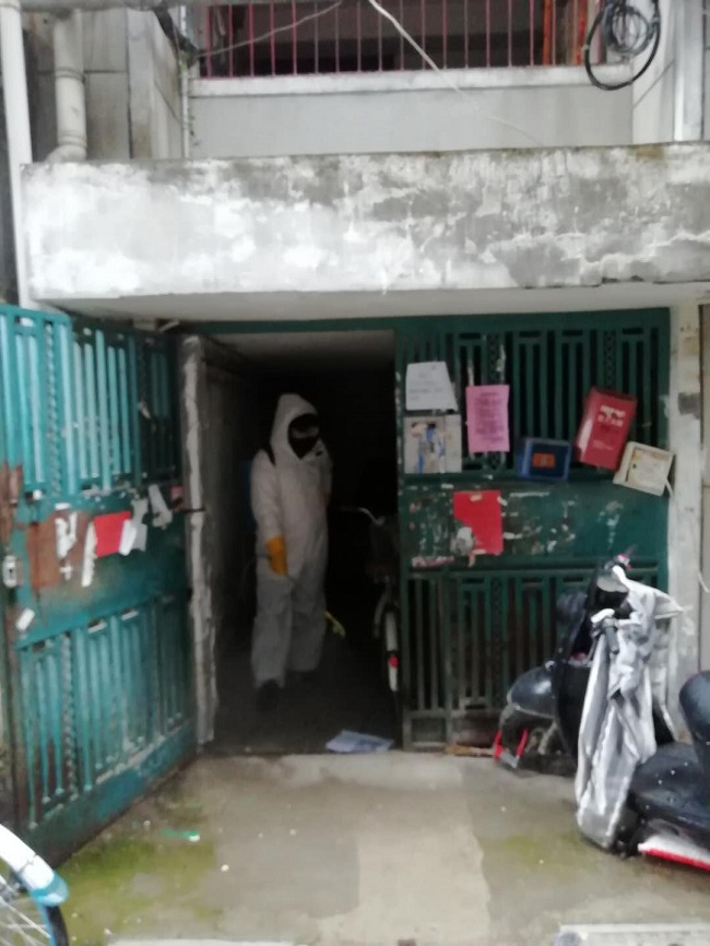 在水陸社區(qū),隊(duì)員毛政權(quán)、魯敏進(jìn)行噴灑消毒作業(yè)近5000平方米