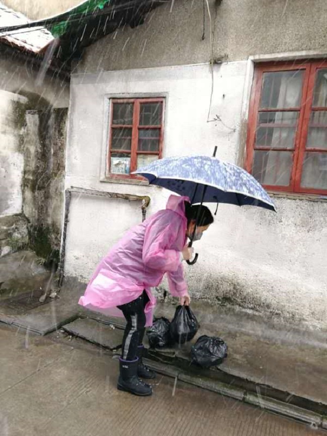 在解放路社區(qū),隊(duì)員朱正凱、秦藝敏冒雨測(cè)量過往人員體溫
