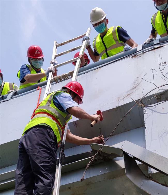 在月湖橋,橋管隊(duì)員趁著雨水間歇期,對(duì)橋梁外側(cè)的懸空線槽和線纜進(jìn)行清理,排除安全隱患。