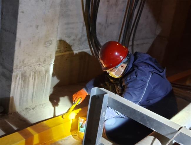 2月5日,江南泵站技術(shù)維修人員發(fā)揮自主維保技術(shù)力量,深入到循環(huán)水池底部有限空間,趟在淤水中對循環(huán)水泵電源電纜、接口耦合、升降鎖鏈的功能運作情況進行檢測修復(fù)及清污除銹;躬身蹲在昏暗狹窄的變電站負一層對止水溝擋水沿涂刷防水漆進行防水措施加固;協(xié)助維保單位在初春寒雨連綿的泵站外江消力池,對拍門進行打磨、除銹,清污、噴漆、緊固螺栓及更換密封條等檢修維保處理。如火如荼的檢修維保工作現(xiàn)場,延續(xù)了江南泵站職工停機不停工的拼搏奮進精神。
