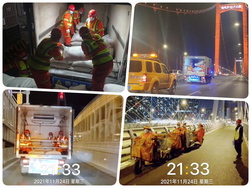 為做好武漢市跨江橋梁融雪防凍工作,確保降雪后橋梁道路通暢、環(huán)境整潔,增強(qiáng)低溫冰凍雨雪極端天氣條件下跨江橋梁道路的應(yīng)急搶險(xiǎn)和保障能力。11月24日夜間,城運(yùn)公司組織開展了融雪防凍應(yīng)急演練。