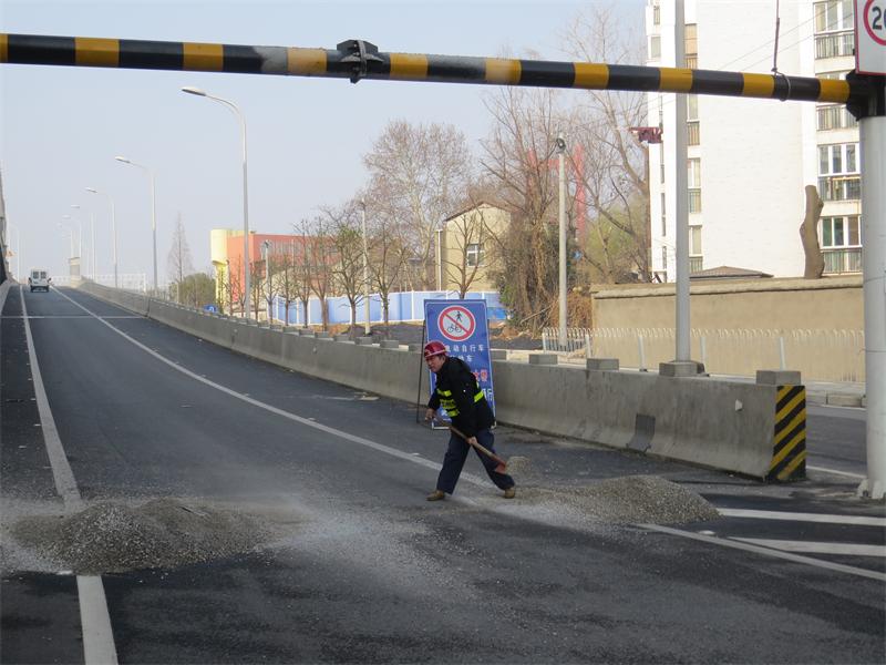 2015年3月7日7:20分,路橋中心鸚鵡洲大橋管理所管護(hù)人員巡查武昌段上橋匝道口時(shí)發(fā)現(xiàn),大量漏灑碎石占據(jù)道路中央,面積約10平方米、重量達(dá)半噸,嚴(yán)重影響了橋面交通通行安全。為避免發(fā)生次生事故,確保橋梁通行暢通,管護(hù)人員按照《橋梁突發(fā)漏灑事故專(zhuān)項(xiàng)處置預(yù)案》要求,利用雙休日車(chē)流較小的有利條件,在漏灑區(qū)域設(shè)置警戒線,使用掃帚、鐵鍬等工具,將碎石轉(zhuǎn)移至路邊。經(jīng)過(guò)1個(gè)小時(shí)左右的緊張作業(yè),橋面碎石漏灑處置完畢,交通恢復(fù)正常。