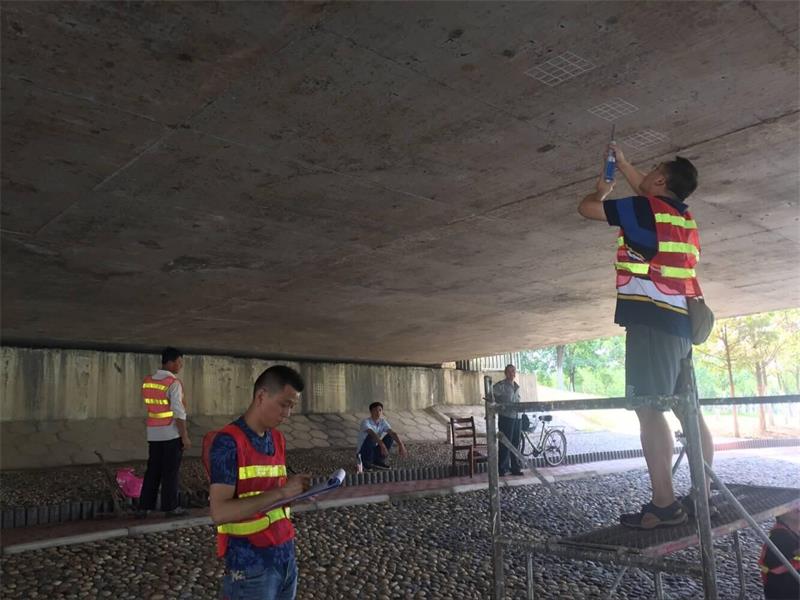 在這次檢測(cè)中,工作環(huán)境最為惡劣的是孝感市體育西路橋。體育西路橋跨越體育西路后湖渠,由于后湖渠嚴(yán)重污染,導(dǎo)致水體嚴(yán)重變質(zhì),發(fā)出陣陣惡臭味,而且梁底板距離水面距離很小,檢測(cè)人員操作面較為狹窄,但是為了完成下部結(jié)構(gòu)的檢測(cè)工作,檢測(cè)人員頂著惡臭,在狹窄空間內(nèi)連續(xù)工作2小時(shí),完成下部結(jié)構(gòu)檢測(cè)工作。兩小時(shí)后,他們身上濕透了,脫掉衣服都可以擰出水來(lái),但是他們并沒(méi)有抱怨,而是為完成本項(xiàng)檢測(cè)工作露出了開(kāi)心的笑容。