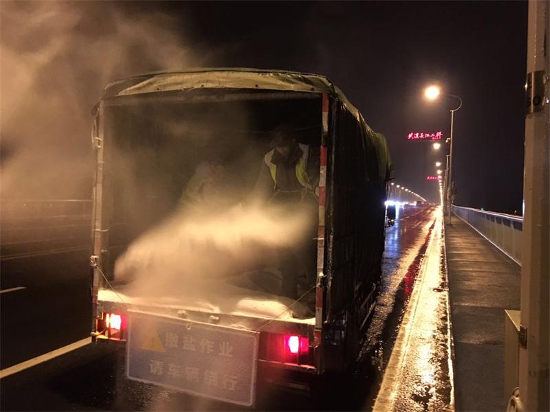 2月7日夜,武漢迎來2017年初雪,市民歡喜著欣賞紛紛落雪時,市路橋中心管護隊員們卻已集結(jié)待發(fā),趕赴各管轄橋梁現(xiàn)場除冰保暢,整晚共出動工作人員85人,車輛23臺,撒鹽42噸,融雪劑14噸,鋪設(shè)草袋350條。
