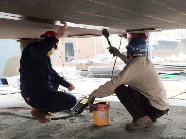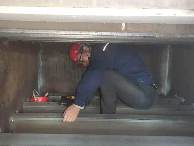 磁粉檢測須對(duì)焊縫進(jìn)行打磨,箱梁結(jié)構(gòu)復(fù)雜,空間狹窄僅容一人,打磨難度大,時(shí)間緊迫,檢測人員和施工人員克服困難,保證焊接質(zhì)量,終于搶在規(guī)定時(shí)間內(nèi)完成了鋼箱梁的加工和檢測,確保搶修工程的順利進(jìn)行。