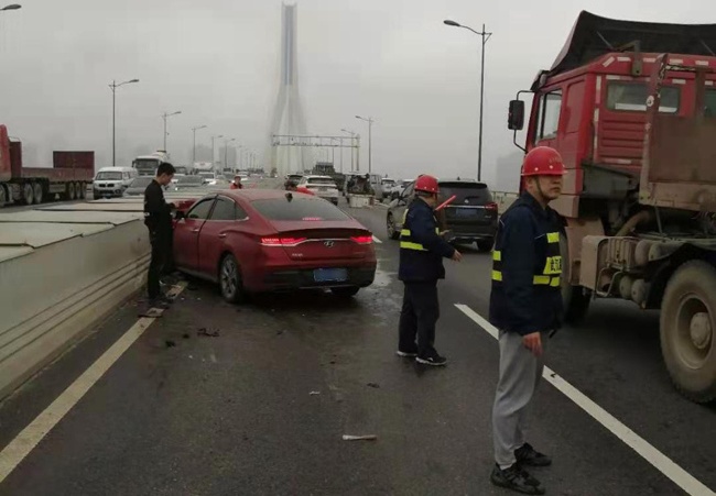 3月31日下午14:30時左右,天興洲運維所當班管護隊正在對橋面掛籃入口進行安全檢修時,發(fā)現(xiàn)橋面有車輛滯留。經(jīng)查,在漢口至青山方向上橋處,一輛面包車在橋面快車道違章??壳謇砗筌噹浳飼r,被后方來車追尾,事故造成兩車嚴重受損,前車上的一名人員右下肢被當場碾斷,橋面交通一度擁堵。