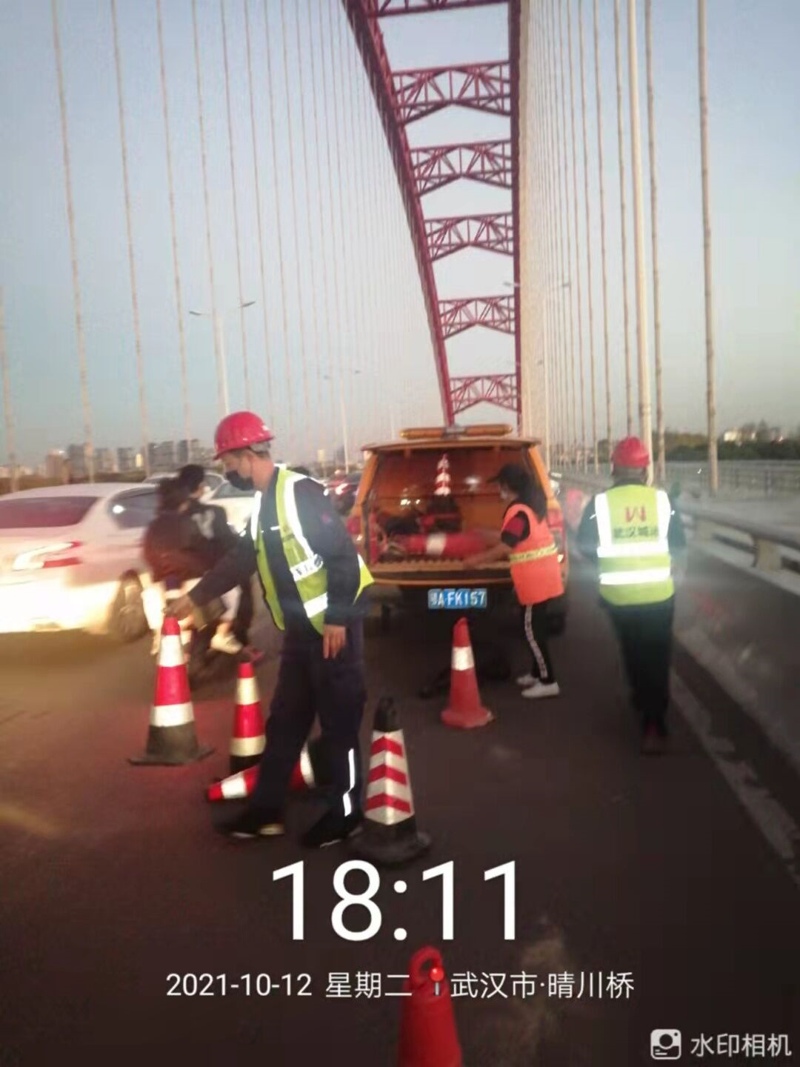 漢江一所管護隊員在接到通知后,及時趕赴漏撒現場。17:35分保潔單位和管護隊員到達現場后發(fā)現漏撒物的確是玻璃渣,漏撒距離約百余米,并且占據了整個車道。此時晴川橋上車流量越來越大,車速也較快,兩位當班管護隊員分工協(xié)作,一名隊員在橋面指揮車輛繞道行駛,一名隊員駕駛巡查車輛將反光錐等安全設施運至事發(fā)地,在漏撒區(qū)域快速擺放好反光錐協(xié)助保潔人員及時進行清掃工作。18:19橋面漏灑物清掃完畢,晴川橋車輛恢復正常通行。