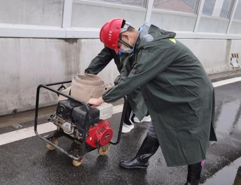 此次防汛排漬演練在仙女山路一號橋橋面、江漢六橋漢陽岸接線工程高架兩處同時展開。運維人員在進行日常巡查時發(fā)現(xiàn),仙女山路一號橋和江漢六橋漢陽岸接線工程高架橋橋面均有大量積水,影響行車安全。經(jīng)開分公司立即啟動防汛排漬預案,組織人員攜帶工具趕赴現(xiàn)場,按照安全作業(yè)標準迅速開展大量積水抽排工作。經(jīng)過30分鐘奮戰(zhàn),橋面積水抽排完畢,險情排除。隨后,灑水車對積水處地面污漬進行沖洗,恢復原貌。
