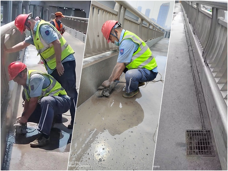為徹底解決橋梁積水問題,楊泗港大橋運維所全所上下動腦筋,想辦法。5月11日,在所長的組織和帶領下,該所管護隊員拿齊工具,對橋面泄水孔進行全面疏撈,并開鑿了約60余米導水槽,經(jīng)過反復試驗,有效的解決了武昌岸坡道雨天積水問題。