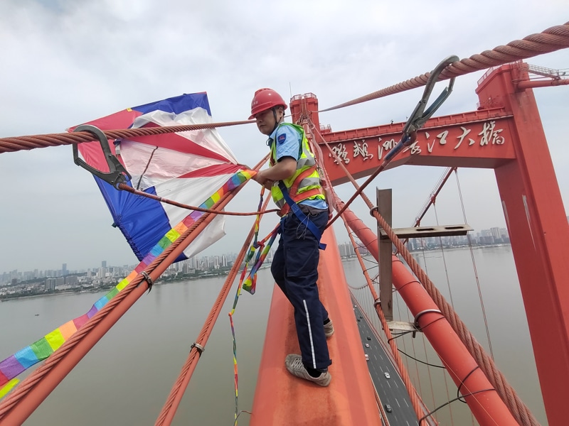 2024年5月16日下午,鸚鵡洲片區(qū)巡查維護(hù)班在對鸚鵡洲長江大橋巡查過程中,發(fā)現(xiàn)鸚鵡洲大橋1號主塔下游側(cè)主纜離江灘地面百米高空上懸掛著一個斷線的風(fēng)箏,臨近下班,鸚鵡洲片區(qū)負(fù)責(zé)人馬東林、唐洪勇立即穿戴好防護(hù)用品,爬上百米主纜及時進(jìn)行清除處置;橋上游人驚嘆直言:給這群“蜘蛛人”點贊!