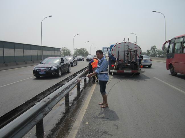 為使清洗工作不影響正常交通秩序,他們一邊有序組織車輛通行,一邊駕駛水車沖洗橋梁設(shè)施,隊員劉國斌和陳秋林光著赤腳,手持水槍頭,在前面用設(shè)施沖水,保潔員緊接其后,用勁抹洗灰塵污垢,汗水打濕衣襟,泥水濺滿全身,但橋梁設(shè)施得以恢復(fù)本色。