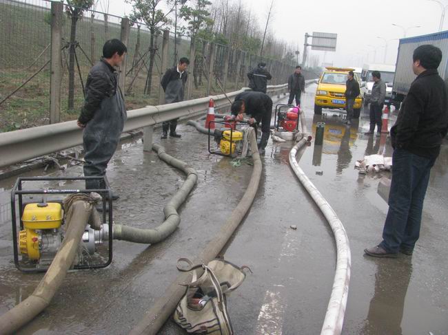 三環(huán)線北環(huán)古田二路段的排水方式為散排,但園林綠化施工后,該段綠化用地明顯高于路面,造成路面積水難以排出,一旦下雨就形成一片“汪海”。對于管轄該路段的長豐橋管理所的隊員們,抽排道路漬水成了他們的重要工作。2月22日,武漢地區(qū)降中大雨,造成三環(huán)線北段古田二路段5處大面積漬水,過往車輛行駛存在嚴重安全隱患。長豐橋管理所隊員們抬機械、裝設(shè)備、穿下水衣,冒雨到漬水點進行抽排工作,累計排抽16個小時,抽排漬水4100立方米,確保了三環(huán)線道路的全線暢通。