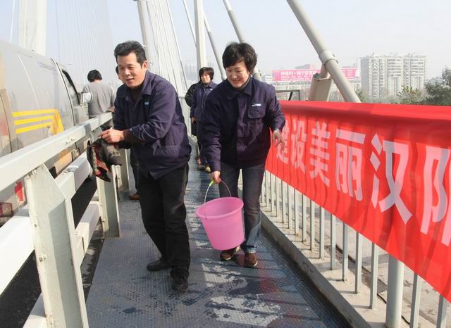 12月5日上午9時(shí),一面紅色鮮艷的“志愿者服務(wù)”旗幟迎風(fēng)飄揚(yáng)在月湖橋主塔旁,來自中心道路橋梁管理處機(jī)關(guān)全體人員和所屬7個(gè)管理所約40多名身著橋管制服志愿者來到月湖橋橋面,一次“踐行文明、清潔橋梁”志愿者服務(wù)活動(dòng)就此拉開帷幕。雖然已是冬季,天氣很冷,但是參加志愿服務(wù)人員熱情高漲,志愿者們開來水車,拿好水桶、抹布等工具,在主橋人行道處由漢陽向橋口方向一字排開,一部分志愿者負(fù)責(zé)提水,搓洗涮抹布,另一部分志愿者則認(rèn)真地擦抹鋼護(hù)欄,工作有條不紊,近3個(gè)小時(shí)的努力工作,月湖橋鋼護(hù)欄設(shè)施更為干凈了。