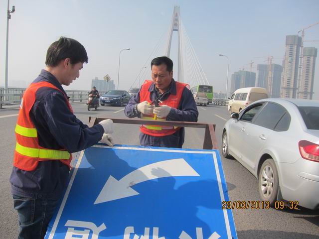 及時(shí)處置安全隱患 確保橋梁安全暢通。3月28日管護(hù)隊(duì)員巡查時(shí)發(fā)現(xiàn),放置在月湖橋正橋至硚口高架橋入口處的“限高3m 超高車輛請(qǐng)走匝道”的指示路牌,因大風(fēng)使連接面板與支架的鉚釘脫落,對(duì)過往的車輛造成安全隱患。管理所及時(shí)組織人員,對(duì)指示路牌脫落的鉚釘進(jìn)行加固,用鐵絲將面板與支架周邊重新固定,消除了安全隱患,確保了橋面行車的安全。