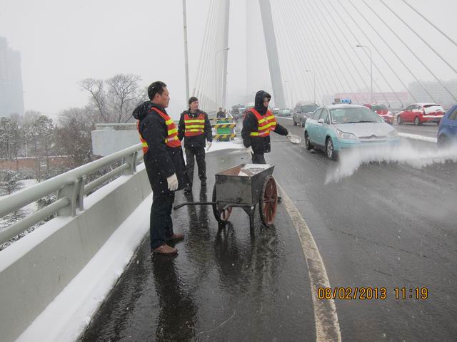 由于提前布置,組織有序,安排得當(dāng),落實到位,道路橋梁管理處負(fù)責(zé)管轄的“七橋”融雪化凍工作有條不紊的開展著。截止目前,共出動車輛17臺次,人員108人次,拋撒化凍工業(yè)鹽28噸,融雪劑14.5噸,確保橋區(qū)行車安全暢通。