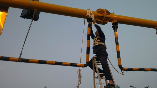 發(fā)現(xiàn)該類情況后,當(dāng)班管護(hù)隊(duì)迅速用反光錐將事故車道封閉,防止次生事故的發(fā)生,留守橋面疏導(dǎo)過往車輛通行。組織人員利用升降梯、鐵絲、安全繩等簡易器材,將撞損限高龍門架扶正,進(jìn)行了臨時(shí)加固處理,在橋面車流早高峰前搶修完畢,并及時(shí)清理了施工現(xiàn)場(chǎng)。