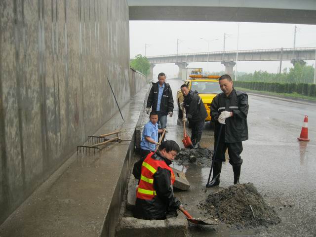 5月15日,風(fēng)雨交加,天興洲大橋管理所黨員、入黨積極分子及當(dāng)班管護(hù)隊(duì)攜帶作業(yè)工具,對(duì)三環(huán)線雙橋村京廣線下穿通道泵站排水邊溝、涵管、擋渣板處存在的廢棄物及淤泥進(jìn)行清淤、疏撈。他們撬開排水邊溝上的混凝土蓋板,先用鐵耙將涵管入口處擋渣板上附著的廢棄物進(jìn)行仔細(xì)清除,然后用鐵鍬對(duì)邊溝積存的泥沙和淤泥進(jìn)行疏撈,通過近3小時(shí)的疏撈工作,共清除廢棄物及淤泥1.5噸,排水邊溝內(nèi)的積水得到迅速的排放,排水管道恢復(fù)了暢通,有效的確保了三環(huán)線的安全暢通。