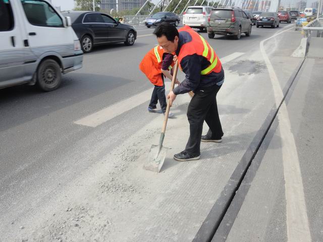 14:30時,管護(hù)隊(duì)員攜帶反光錐筒、鐵鍬、水桶,趕至漏灑地點(diǎn),一邊用反光錐筒,將污染橋面隔離出來,對行駛車輛進(jìn)行分流,一邊指揮保潔員,用鐵鍬將已凝結(jié)的水泥塊一點(diǎn)點(diǎn)的鏟除,集中后清掃;用水桶就近取水,對鏟除泥漿后留下的污跡進(jìn)行簡易沖洗。16:30時,經(jīng)過2小時的努力,橋面污染帶基本清除。16:45時,保潔單位組織水車對橋面進(jìn)行沖洗,月湖橋橋面恢復(fù)了干凈整潔。
