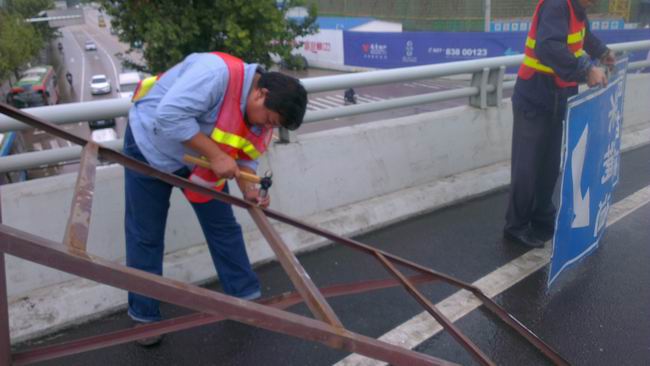 為提示超高車輛繞行,月湖橋橋面設(shè)置了車輛通行導(dǎo)向牌。9月6日,管理所安全周查時發(fā)現(xiàn),橋面硚口高架入口處設(shè)置的交通導(dǎo)向牌,被違規(guī)車輛撞損變形。為保障交通行車安全,月湖橋管理所不等不靠,及時組織人員自行修復(fù)導(dǎo)向牌,確保了車輛通行安全。