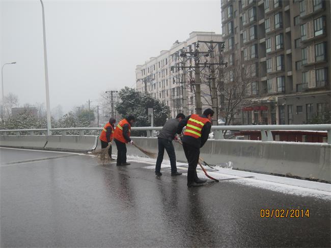 根據(jù)路橋中心橋梁融雪防凍預案的要求,所轄各橋梁管理所全體人員進入警備狀態(tài),保持電話暢通,人員車輛做到隨叫隨到。當班管護隊密切關注天氣情況,在原巡檢次數(shù)的基礎上,增加了對橋面路況的巡查次數(shù),對橋面坡道、匝道、人行梯道等重點路段進行安全巡檢工作,并對融雪物資及橋面安全標牌設施逐一進行檢查,對橋面存在有積水、結冰的路段迅速組織人員進行清掃和撒鹽化凍,確保道路通行安全。