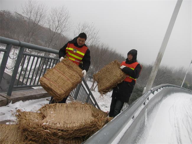 時逢節(jié)后返城高峰,路橋中心組織有序,安排得當,共計撒鹽10.6噸,融雪劑16.5噸,鋪設草袋1270條,有效地確保了所轄橋梁車輛行人的通行安全。