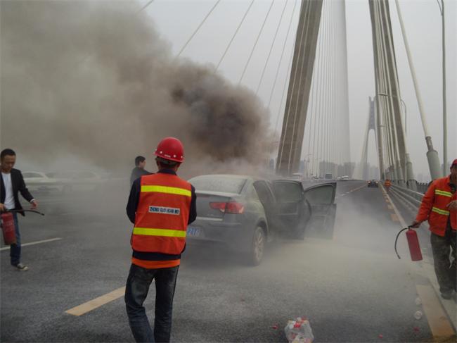 4月23日16:38分,路橋中心二七長江大橋管理所在監(jiān)控中發(fā)現(xiàn),二七長江大橋漢口至武昌方向,一輛銀灰色轎車發(fā)生自燃著火。發(fā)現(xiàn)險情后,該所立即啟動《橋梁突發(fā)事件應急預案》,當班管護隊員攜帶滅火器趕赴現(xiàn)場,對事故現(xiàn)場進行隔離,用攜帶的滅火器對車輛進行撲救,但因火勢蔓延太快,轎車在短時間內被燒得只剩骨架。隨后,武漢消防官兵趕到事故現(xiàn)場對燒損的轎車作降溫處理。事故車輛被拖走后,管理所立即組織人員對事故現(xiàn)場進行清掃沖洗,并對橋梁設施受損情況進行檢測。