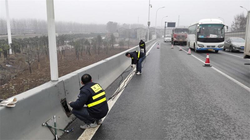 新年伊始,橋梁管護隊員首先對維修施工現(xiàn)場做好安全防護,進行交通疏導(dǎo),在確保施工安全的情況下,把有故障的三根電纜從擋墻內(nèi)逐一抽出,再重新穿設(shè)需更換的新電纜。穿設(shè)新電纜時,由于部分擋墻因橋面震動發(fā)生變形,新電纜穿設(shè)困難。管護隊員們嘗試了多種牽引方式,才將電纜穿設(shè)成功,并將新電纜在兩端路燈檢修口處對接,完成了維修工作。