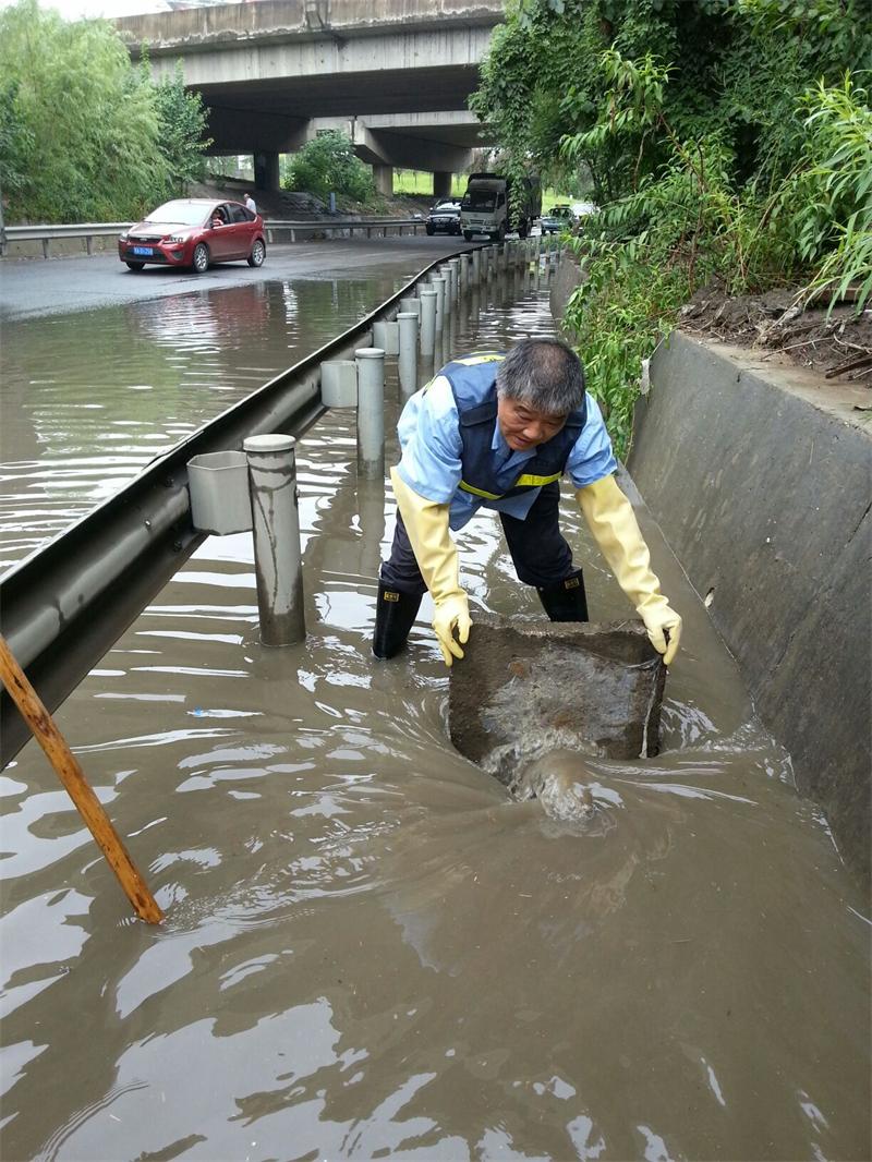 8:45分,天興洲大橋漢施立交HF匝道因地勢低洼發(fā)生漬水約40公分,導致出城車輛受阻,排隊出城車輛延伸至主橋面,此時段是該所當班人員交接班時間,為了迅速處置漬水問題,下夜班的員工自覺投入到排漬工作中,該管護隊隊長許紹俊同志身先士卒,拿著工具涉水撬開漬水區(qū)的邊溝蓋板,讓漬水快速流入涵管內(nèi),其余員工疏撈擋渣蓋板處的雜物及邊溝內(nèi)堵塞的淤泥。經(jīng)過近1個小時的疏排,匝道內(nèi)的漬水排干,道路恢復了正常通行。