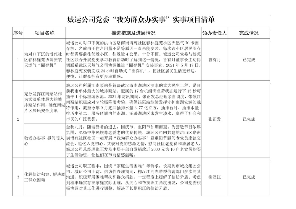 為深入學習貫徹習近平新時代中國特色社會主義思想,根據(jù)黨史學習教育有關要求,推動公司領導班子成員踐行為人民服務的初心使命,結合城運公司實際,用心用情用力解決基層的困難事、群眾的煩心事,增強人民群眾的獲得感幸福感安全感,讓群眾真正感受到實踐活動帶來的新氣象新變化,現(xiàn)將城運公司黨委“我為群眾辦實事”實事項目清單公示如下: