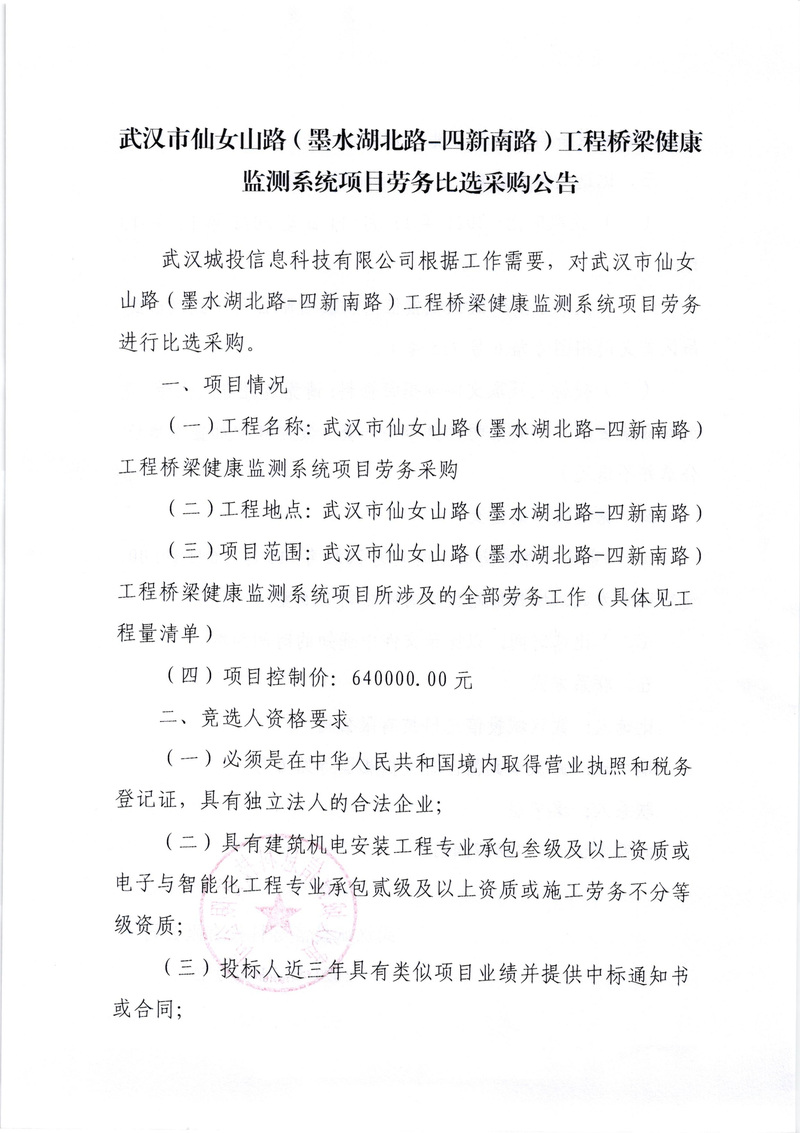 武漢市仙女山路(墨水湖北路-四新南路)工程橋梁健康監(jiān)測系統(tǒng)項目勞務(wù)比選采購公告