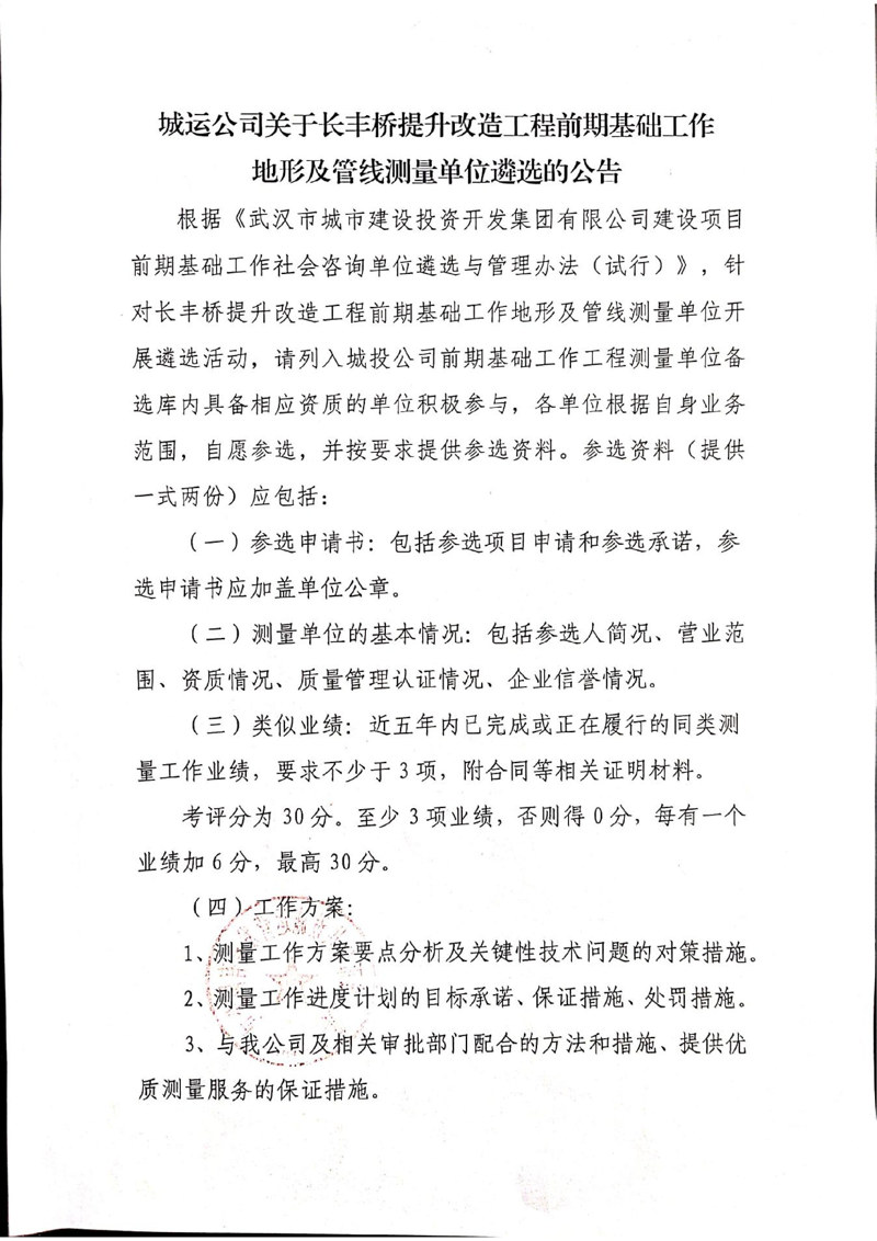 城運公司關(guān)于長豐橋提升改造工程前期基礎(chǔ)工作地形及管線測量單位遴選的公告