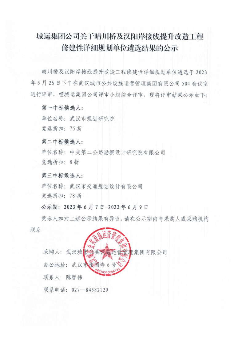 城運(yùn)集團(tuán)公司關(guān)于晴川橋及漢陽(yáng)岸接線提升改造工程修建性詳細(xì)規(guī)劃單位遴選結(jié)果的公示